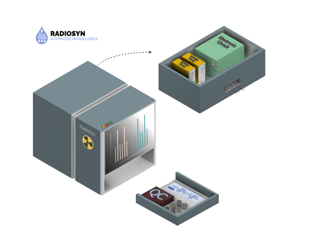 RadioSyn is designing and manufacturing a miniaturized automated radiochemical synthesis platform. By integrating continuous flow microfluidic engineering with automated synthesis capabilities, RadioSyn delivers a shielded, state-of-the-art synthesizer that eliminates traditional production barriers and complexity. The platform uses disposable microfluidic chips that perform end-to-end chemical and radiochemical reactions. Our automated synthesis technology platform addresses critical limitations in conventional diagnostic and therapeutic workflows by standardizing and streamlining radioimmunoconjugate and radiopharmaceutical manufacturing. The Radiosyn platform offers reproducible, high-quality radiopharmaceutical production across research and clinical settings, requiring minimal specialized radiochemistry expertise. Our mission is to accelerate scientific discovery and clinical use of radiopharmaceuticals by making their production more accessible, standardized, and scalable.